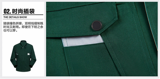 JL-QD225定做工作服以軍綠色為主調(diào),領口采用淺灰色搭配,襯托出時裝者的時尚動感。甄選高品質(zhì)面料,讓您穿著舒服,時尚。