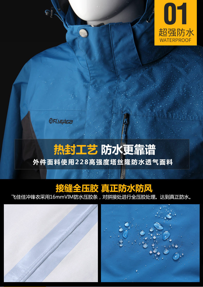 面料采用專業防水面料,選用克重高達300g的抓絨面料。加厚搖粒絨內膽,衣服雙側口袋,滿足不同身材,不松不緊,穿著舒適。接縫全壓膠,防水透氣達到專業級別;