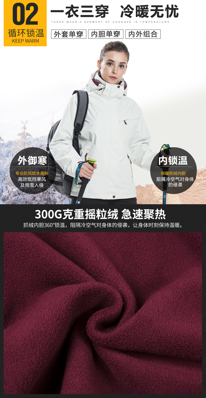 防風防雨,鎖溫保暖,腋下透氣網洞,3合1沖鋒衣,內膽可拆卸